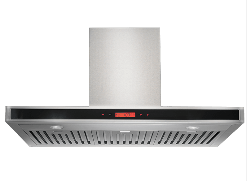 A stainless steel flat canopy with black glass panel gives this rangehood a modern sleek look.